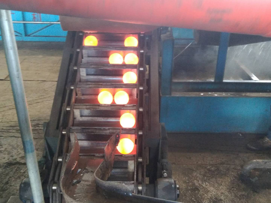 4、軋成后的紅熱態鋼球立刻進入在線熱處理熱備進行淬火—回火熱處理,使鋼球獲得很高而且均勻的硬度。