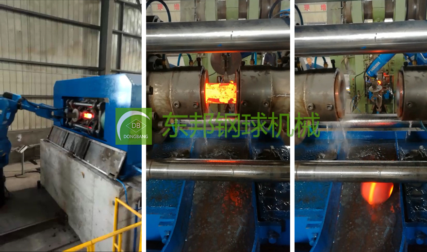 3、紅熱態的鋼坯被送入鋼球軋機后,在2個帶有特殊螺旋形孔型的軋輥之間旋轉前進,并被連續地旋切成鋼球。每臺鋼球軋機每分鐘可軋成200~360個鋼球。